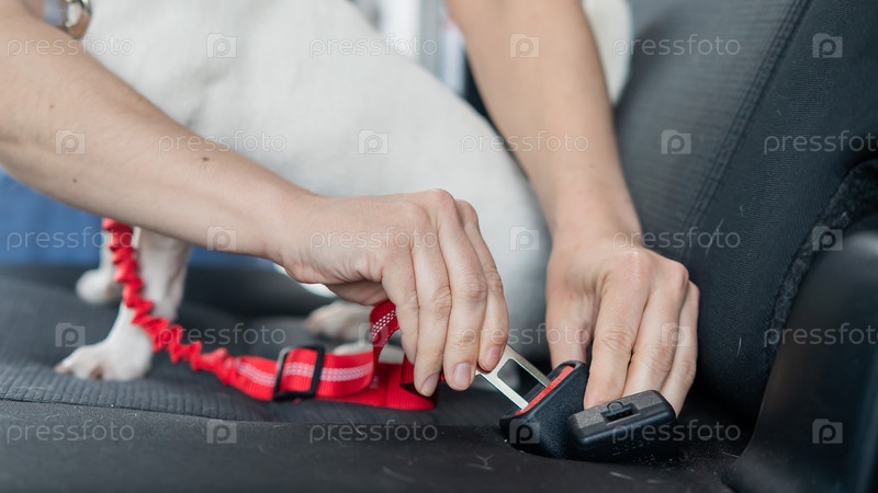 Женщина едет на машине со своей собакой.Владелец пристегнул Джек Рассел Терьера ремнем безопасности