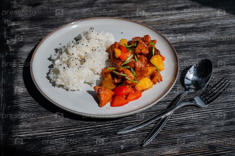 Свинина в кисло-сладком соусе с вареным рисом на тарелке
