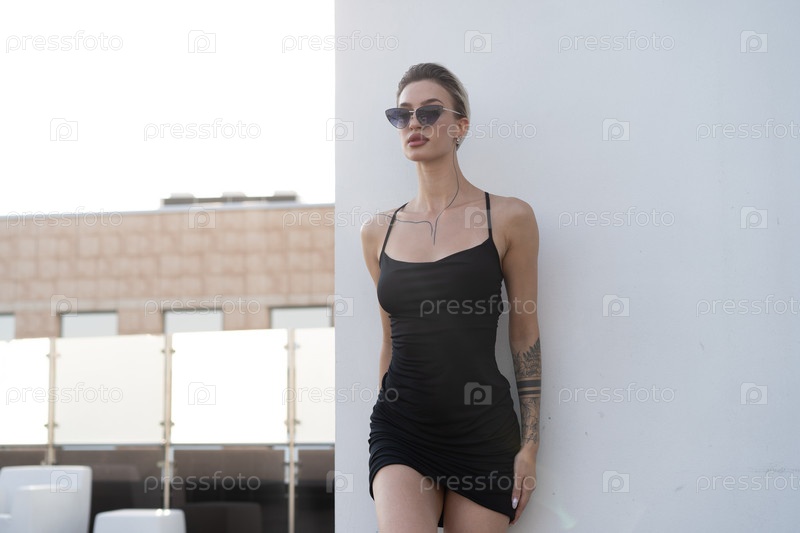Молодая красивая женщина позирует в черном платье в студии