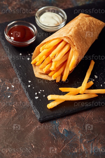 Вкусные картофель фри на режущей доске, на фоне деревянного стола