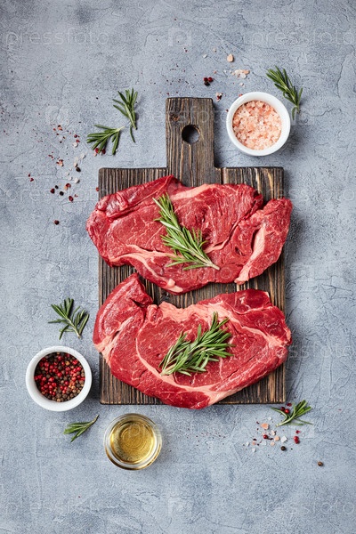 Два свежих сырых Prime Black Angus Beef Steaks, Rib Eye, Денвер, на деревянной режущей доске