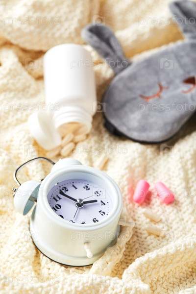 Маска для сна, будильник, затычки для ушей и таблетки.Концепция здорового ночного сна