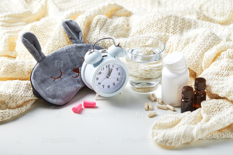 Маска для сна, будильник, затычки для ушей и таблетки.Концепция здорового ночного сна