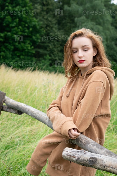 Красивая молодая женщина позирует в коричневом свитере на улице деревни