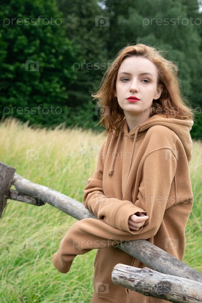 Красивая молодая женщина позирует в коричневом свитере на улице деревни