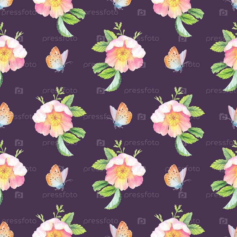 Бесшовный рисунок розы и бабочки. Ручное акварельное искусство. Для дизайна упаковки, карт, обложек, принтов, этикеток на продуктах и тканей