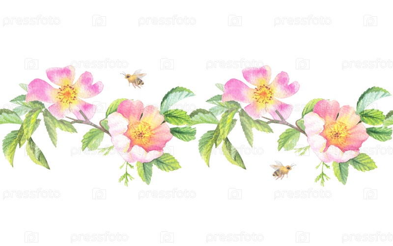Бесшовная граница розы и пчелы. Ручное акварельное искусство. Для дизайна упаковки, карт, обложек, принтов, этикеток на продуктах и тканей