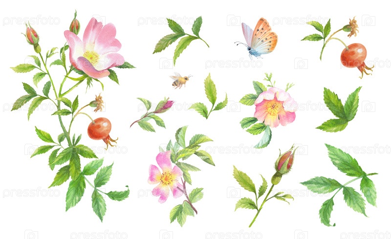 Розешип установил композицию. Ручное акварельное искусство. Для дизайна упаковки, карт, обложек, принтов, этикеток на продуктах и тканей