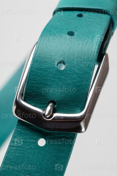 Часть изумрудной кожи классического пояса с застежкой на сером фоне