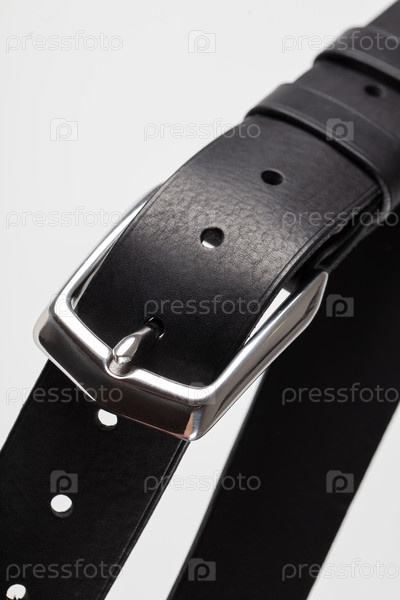 Часть классического пояса из черной кожи с застежкой на сером фоне