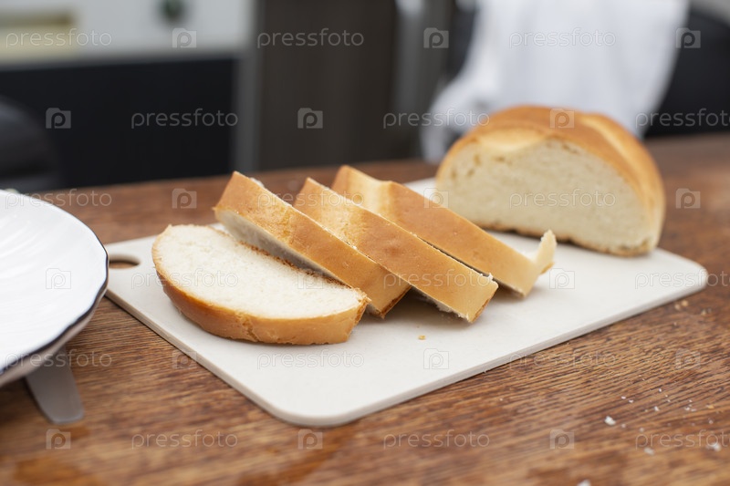 На деревянном столе лежат нарезанные кусочки белого хлеба