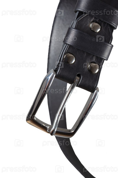 Часть кожаного ремня с металлической застежкой вблизи изолирована на белом фоне