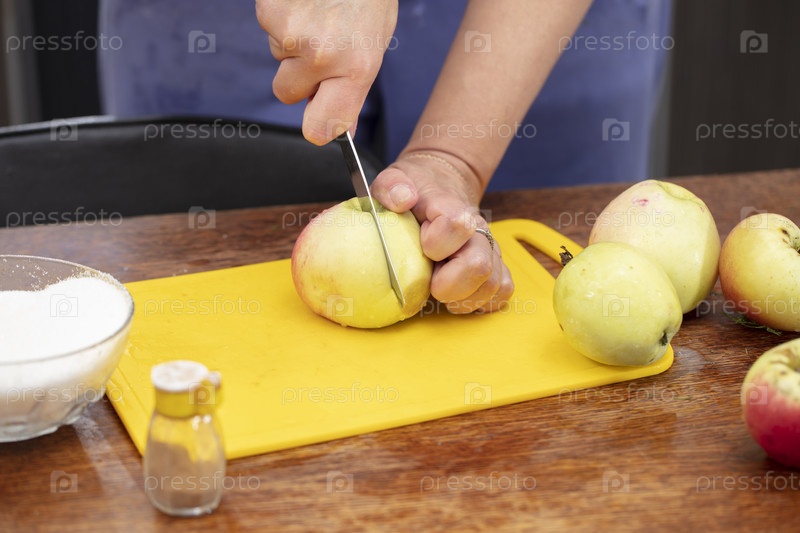 Руки режут яблоки ножом.Приготовьте здоровую пищу из фруктов