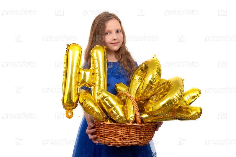 Маленькая девочка в праздничном голубом платье держит золотой комплект надувных писем с днем рождения. изолированные на белом фоне