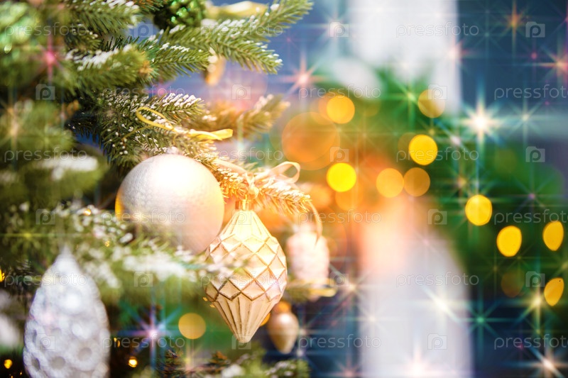 Часть рождественской елки с украшениями в огнях и золотой боке