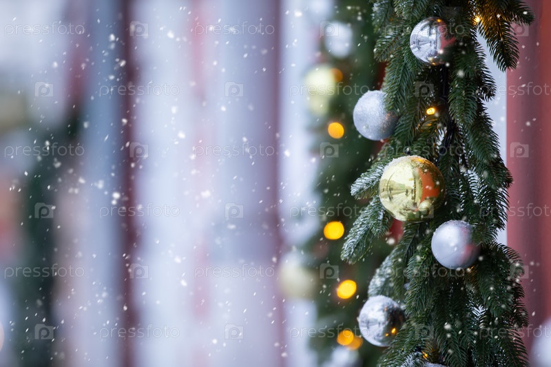 Часть рождественской елки, покрытой снегом среди размытого города