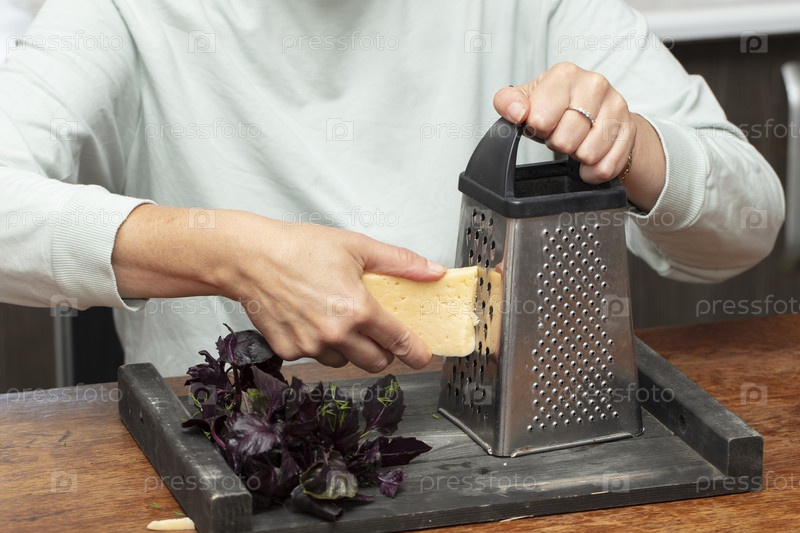 Руки протирают сыр на металлическом гребле.Приготовьте еду из сыра и базилика