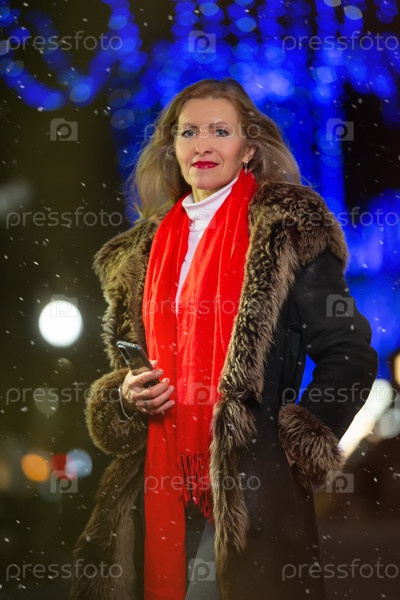 Портрет красивой женщины средних лет в вечернем зимнем городке