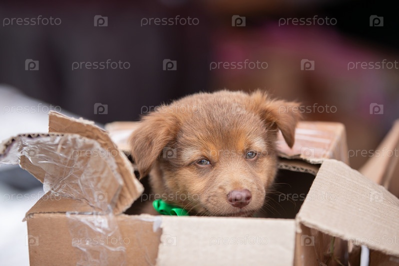Маленькое брошенное уличное щенко видит в картонной коробке и смотрит на камеру умными глазами