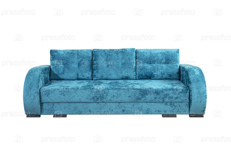 Бирюзовый диван с подушками из волосистой ткани изолирован на белом фоне