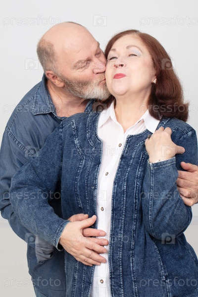 Портрет любящей пожилой пары, ласковый взрослый муж целует свою прекрасную жену