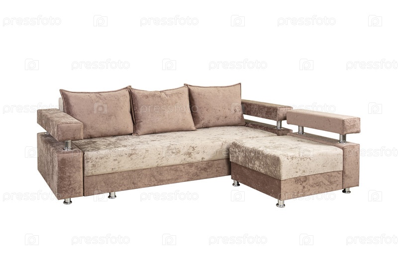 Бежевый угловой диван с подушками из бархатной ткани, выделенными на белом фоне