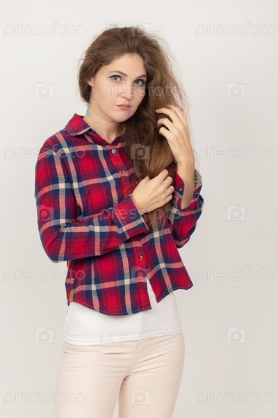 Женщина с длинными волосами, одетая в красно-синюю квадратную рубашку. она смотрит на камеру со серьезным выражением лица
