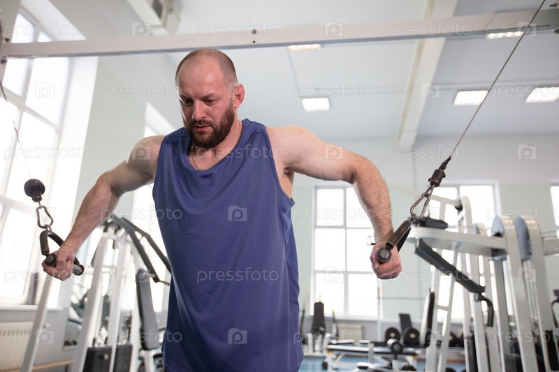 Мужчина-бодибилдер тренируется в тренажерном зале, силовая подготовка на канатной дороге
