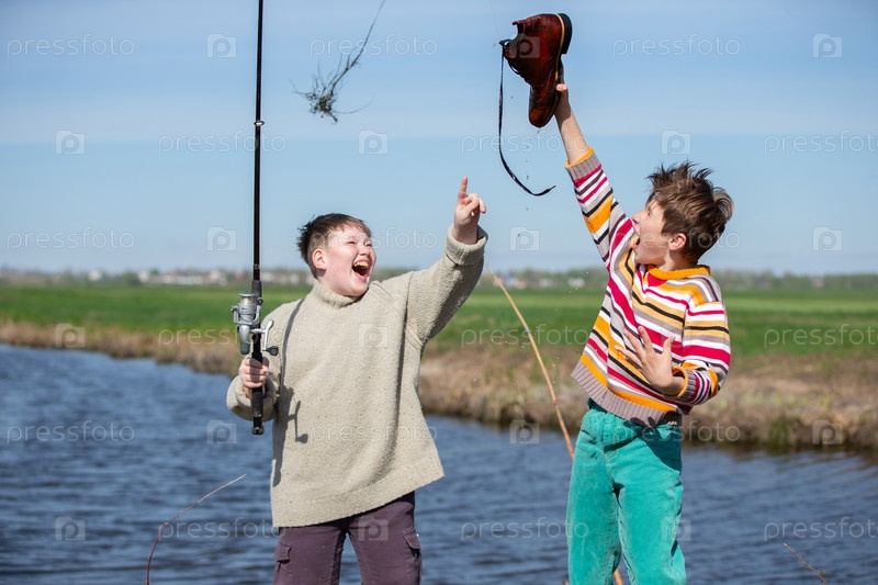 Два друга мальчика зацепили старую рыболовную удочку для обуви и посмеялись