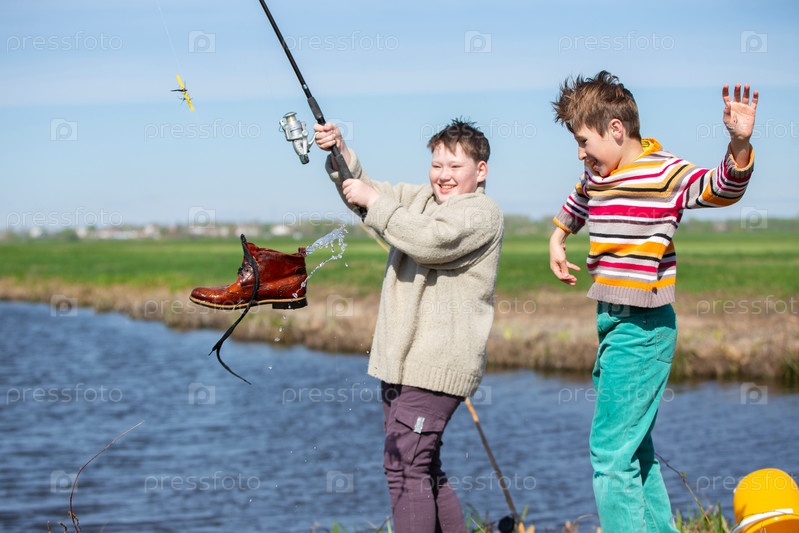 Два друга мальчика зацепили старую рыболовную удочку для обуви и посмеялись