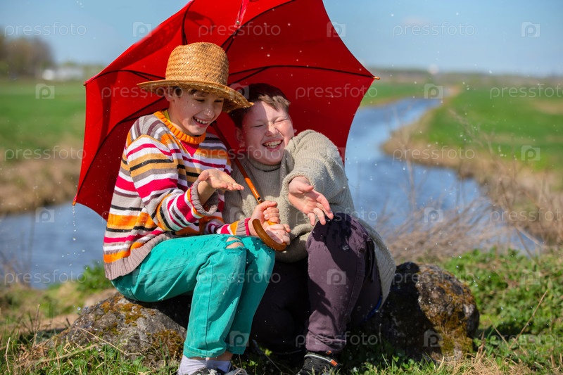 Двое друзей смеются под зонтиком в дождь.Дети, попавшие под дождём на открытом воздухе
