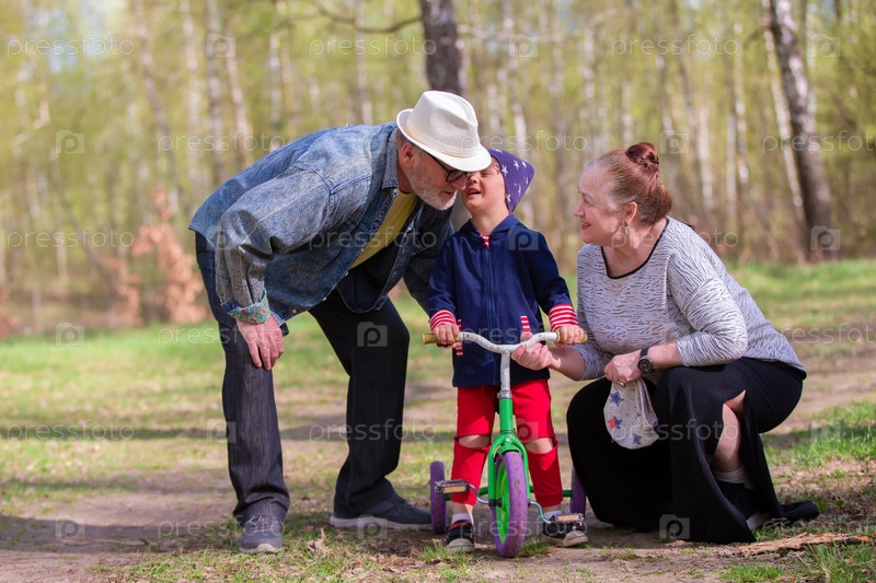 Внук и дедушка ездят на велосипеде в парке