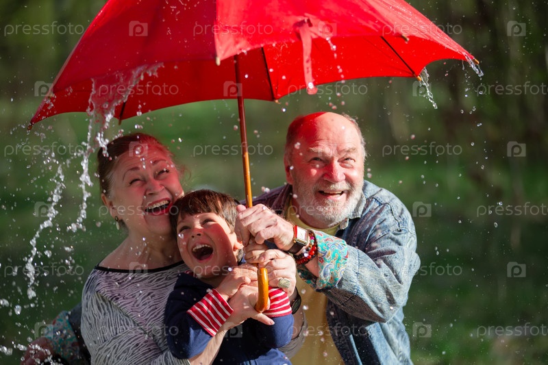Дедушка и внук держат зонтик, а бабуля смотрит на них
