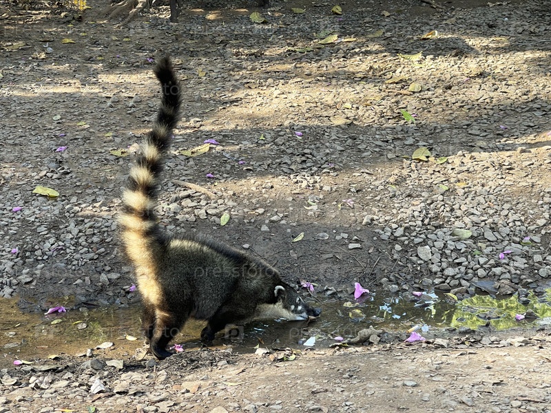 Коати пьет воду из лужи в Национальном парке Игуасу, Аргентина
