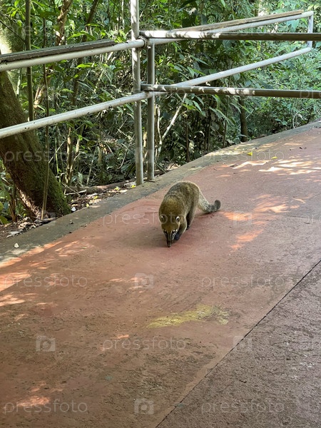 Коати на железнодорожной платформе в Национальном парке Игуасу, Аргентина