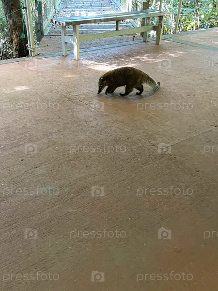 Коати гуляет по железнодорожной платформе в Национальном парке Игуасу, Аргентина