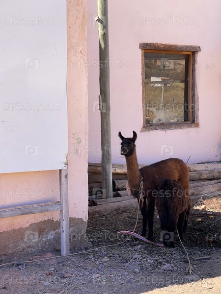 Маленькая лама ест молоко своей матери возле розового дома в горах Аргентины