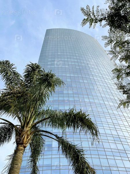 Пальма и небоскреб на фоне голубого неба в жилом районе Пуэрто-Мадеро, Буэнос-Айрес, Аргентина