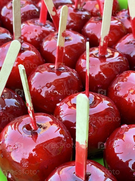 Кармелированные яблоки на палке. яркий фруктовый фон