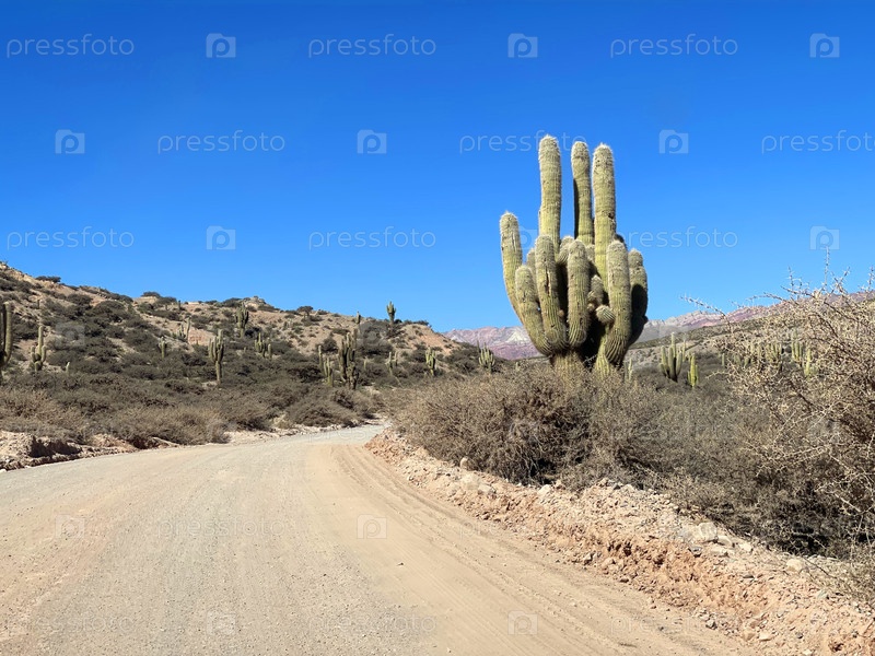 Гигантские кактусы растут вдоль дороги в провинции Jujui, Аргентина