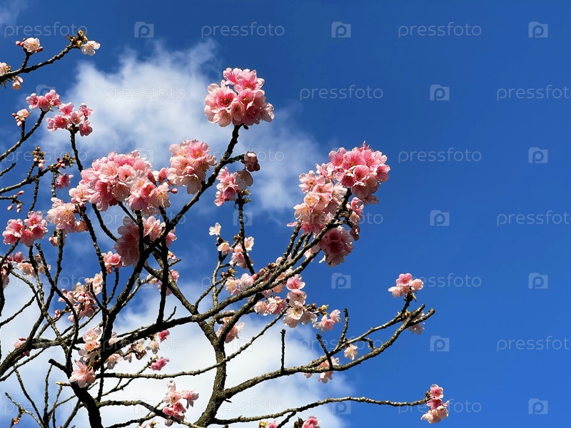 Ветка цветущего дерева на фоне синего неба.Розовые вишни цветят в Буэнос-Айресе, Аргентина