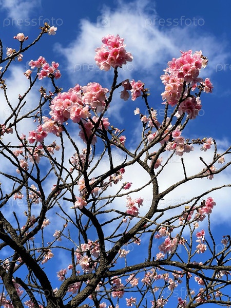 Ветка цветущего дерева на фоне синего неба.Розовые вишни цветят в Буэнос-Айресе, Аргентина