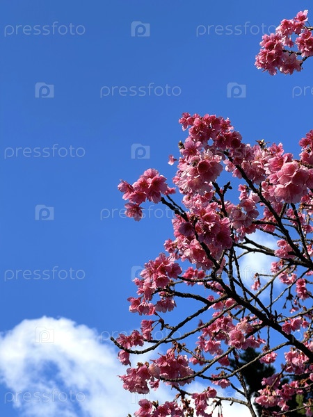 Ветка цветущего дерева на фоне синего неба.Розовые вишневые цветки, Буэнос-Айрес, Аргентина