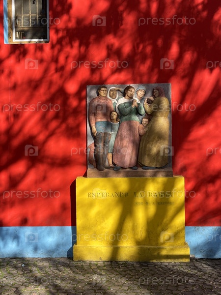 23 июля 2023 года - Ла-Бока, Буэнос-Айрес, Аргентина: яркие красочные улицы с бросающимися в глаза домами и большими фигурами на домах