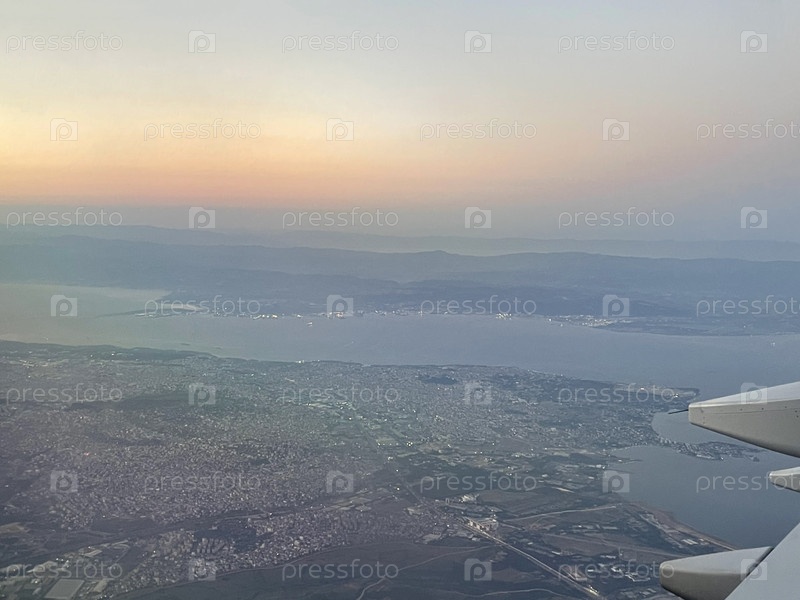 Вид из окна самолета на море и город Закат солнца