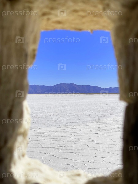 Вид на соляное болото через окно дома, сделанного из соли.Салинас-Грандес, Аргентина