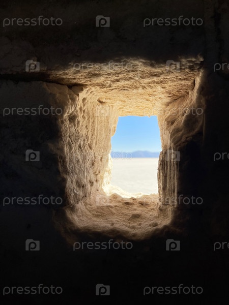 Вид на соляное болото через окно дома, сделанного из соли.Салинас-Грандес, Аргентина