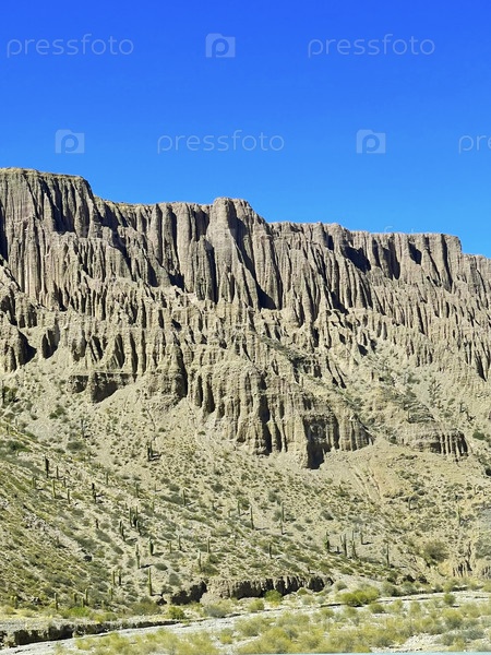 Разрушенные горы, заросшие огромными кактусами в регионе Джуджуи в солнечный день, Аргентина