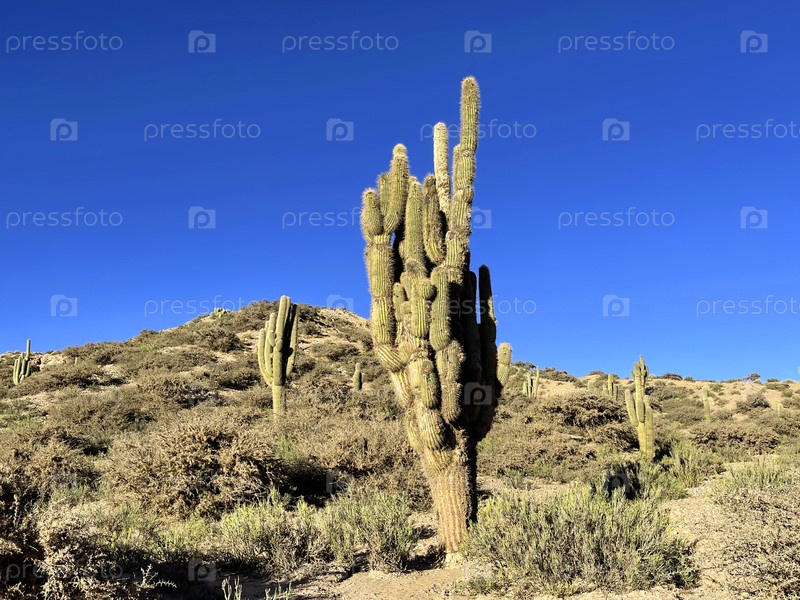 Разрушенные горы, заросшие огромными кактусами в регионе Джуджуи в солнечный день, Аргентина