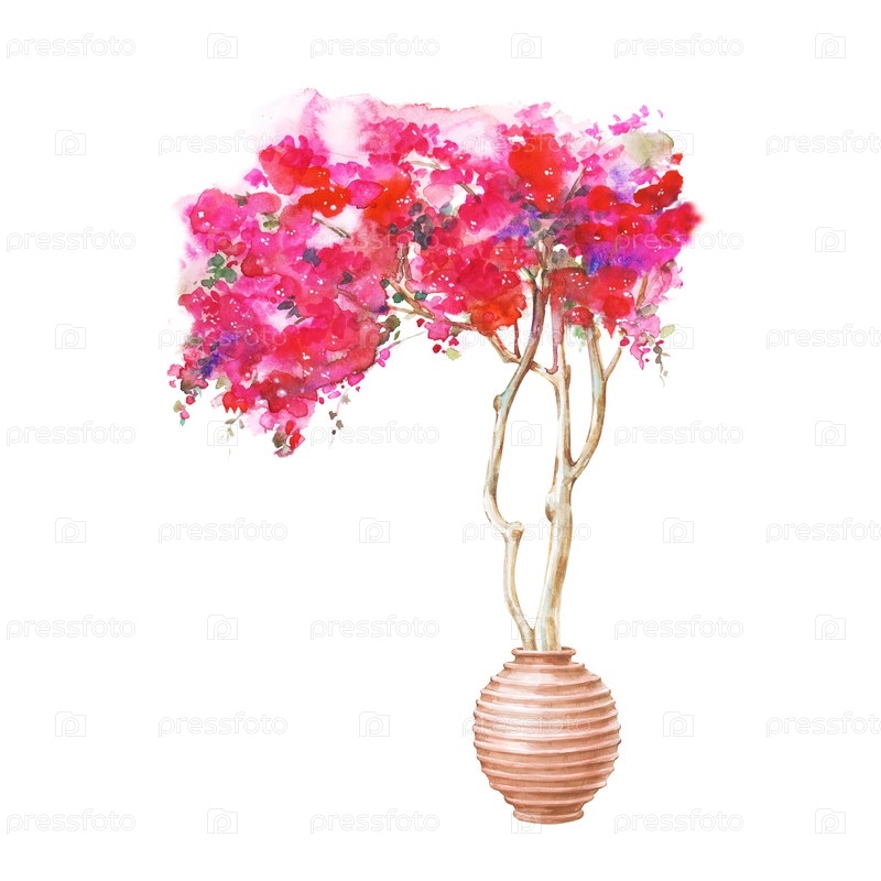 Ярко-розовый бугенвилья в глиняном горшке, нарисованный от руки. Иллюстрация акварели. Средиземноморский цветочный куст изолирован на белом фоне. Клипарт. Путешествие